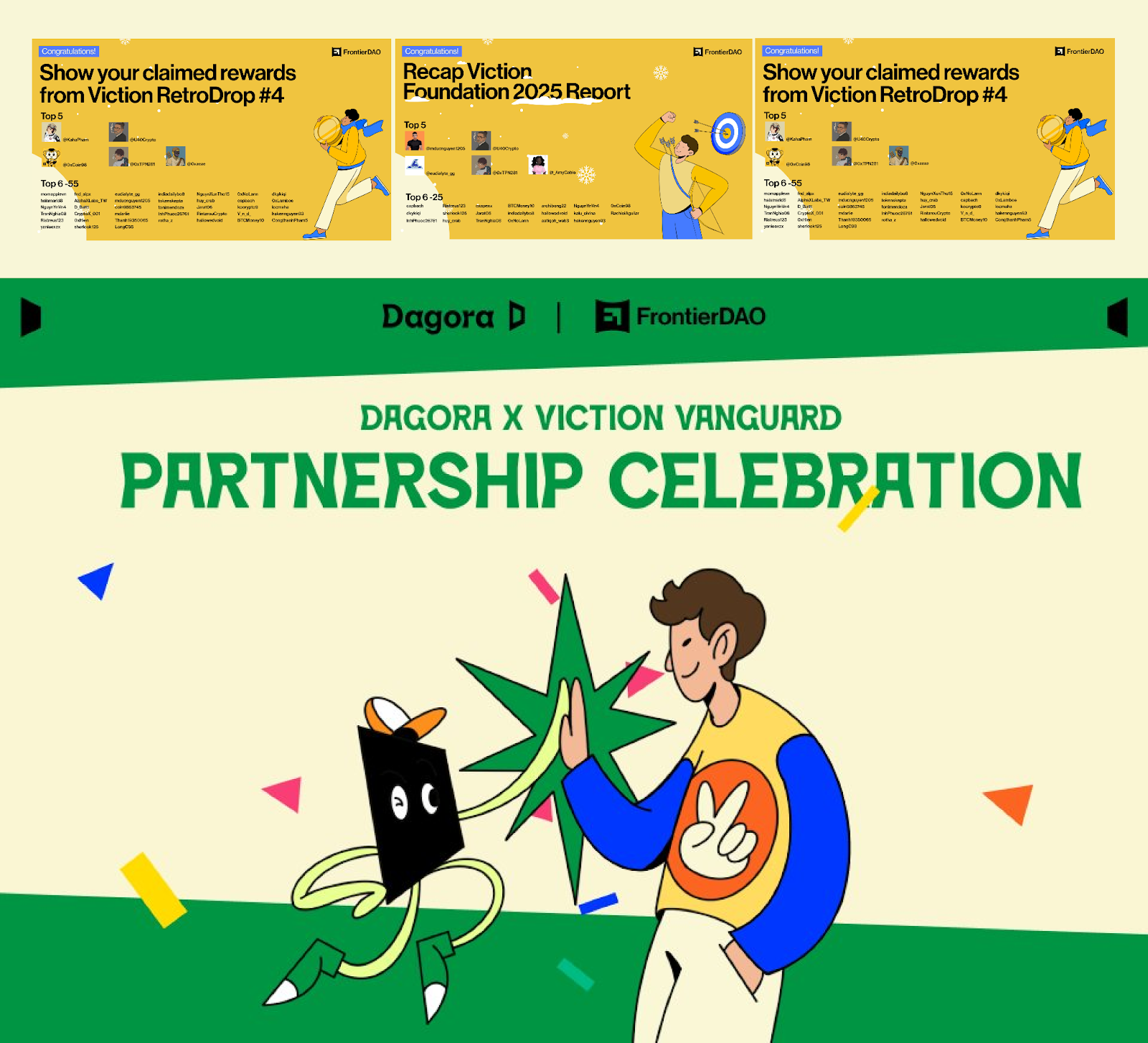 This month marked the launch of the partnership between FrontierDAO and Dagora. This expands access to the Dagora NFT marketplace on Viction and paves the way for upcoming creative and ecosystem-focused bounties on the Vanguard platform.