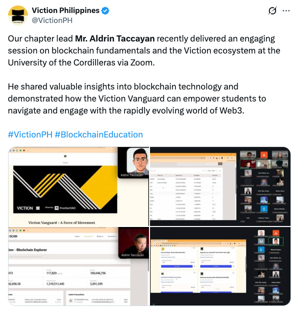 Web3 and blockchain education continued to expand, highlighted by a session led by Aldrin Taccayan, Chapter Leader of Viction Philippines, at the University of the Cordilleras (via Zoom). He introduced students to blockchain fundamentals and the Viction ecosystem, while showcasing how Viction Vanguard can empower them to explore, participate in, and navigate the evolving Web3 landscape.